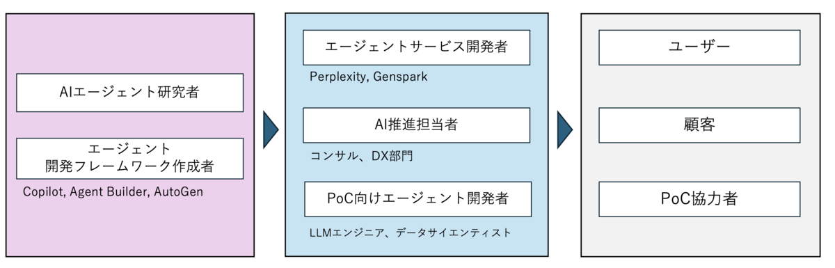 記事のターゲット層を絞るためにAIエージェントに関わる人材の関係図を示します。